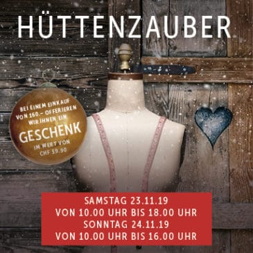 Lassen Sie sich am Samstag 23. November und am Sonntag 24. November vom Hüttenzauber verzaubern. Wir verteilen schon vor Weihnachten Geschenke. Bei einem Einkauf ab 160 Franken, schenken wir Ihnen ein wohliges und kuscheliges Geschenk. Lassen Sie sich überraschen.